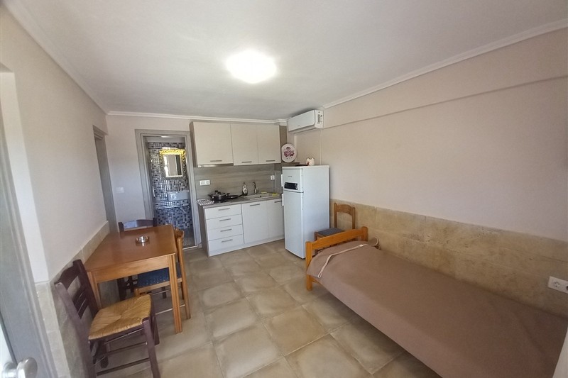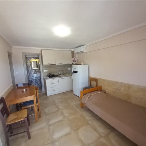 1 /5 Дуплекс на приземје - Располага со 2 Спални соби и дневен престој. Во едната спална има брачен кревет и нема природна светлина (прозор) и втора спална соба со два единечни кревети. Во дневна соба има единечен кревет и во истата просторија е со кујна - опремена со голем фрижидер и решо. Климата и ТВ се во дневната просторија.
